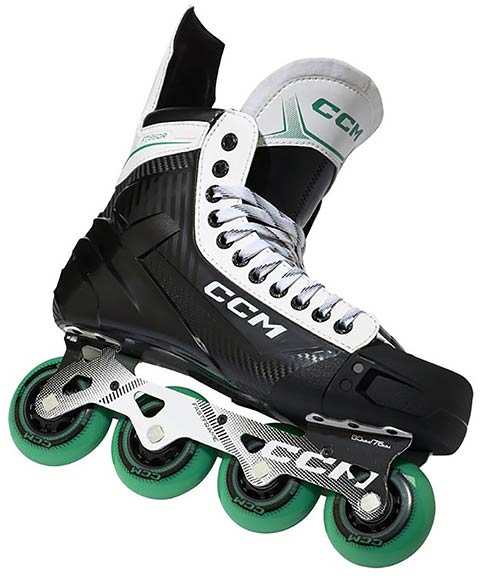 For skating characteristics, the skate uses a two-piece Hi-Lo steel chassis designed for balance and agility. The CCM roller wheels are mounted in a staggered setup: smaller wheels support quick direction changes, larger wheels increase speed. With an 82A hardness, the wheels are built for durability and balanced grip on a variety of surfaces. ABEC 5 bearings round out the setup with smooth roll for training and recreational games.